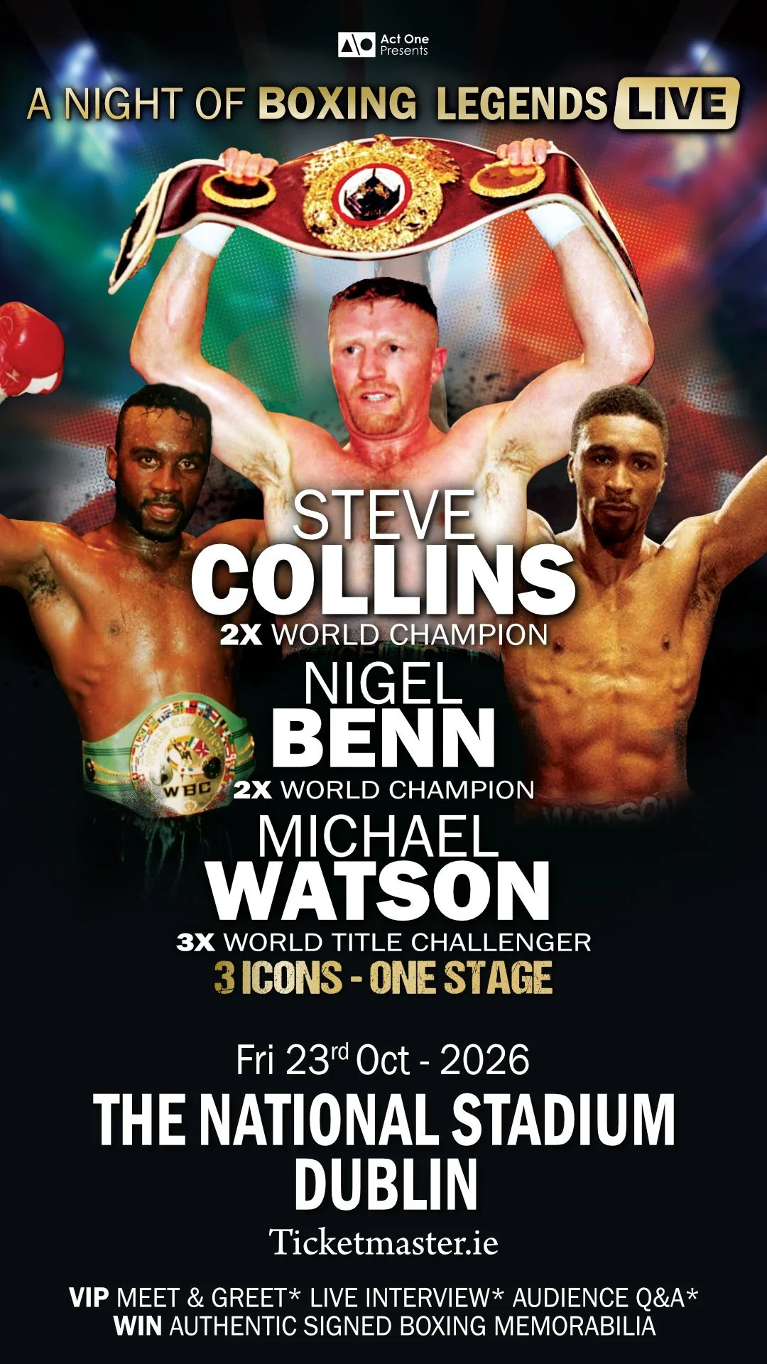 Join Irish legend and 2x world champion Steve Collins, 2x wold champion Nigel Benn and 3x world title challenger Michael Watson. together live on the one stage, with VIP meet & Greet, Live Interview, Audience Q&A and the chance to win authentic signed boxing memrobilia.
