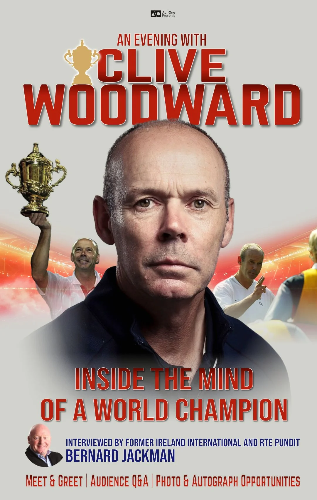 Join Former Irish international and RTÉ Rugby pundet Bernard Jackman as he inteviews legendary, World Cup winning coach Sir Clive Woodword with Audience Q&A’s Meet and Greet, and opportunities for Photos and Autographs.